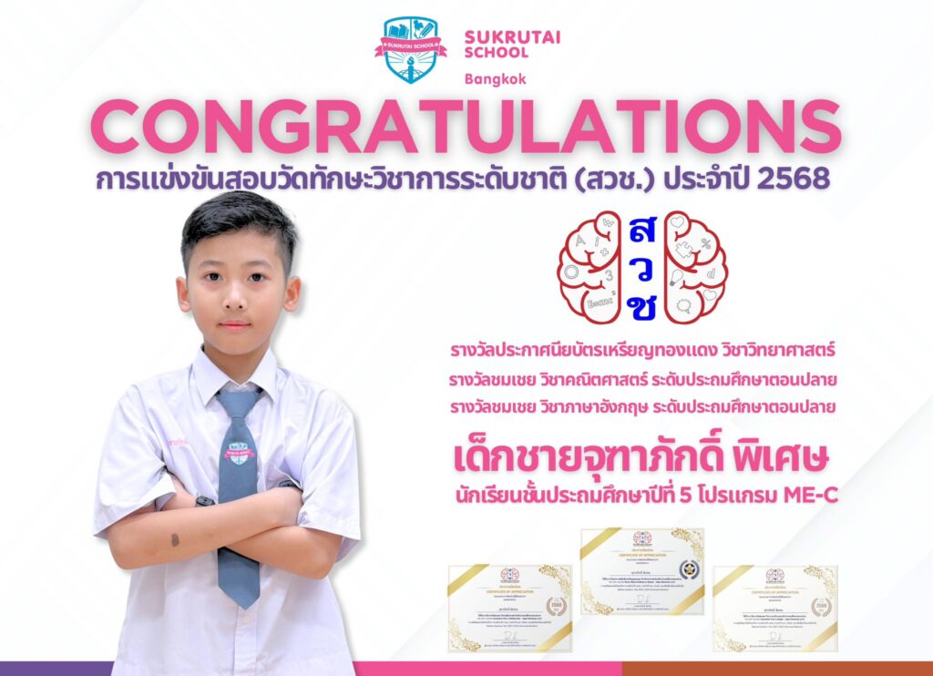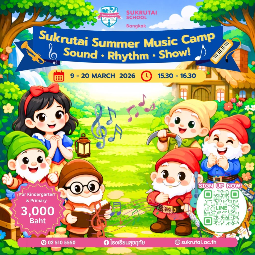 วันเด็กแห่งชาติ ประจำปี 2569 และ กิจกรรม Sport Day Sukrutai School Sport Day “Color of Harmony-สีสันแห่งมิตรภาพ” วันเสาร์ที่ 10 มกราคม 2569 คำขวัญวันเด็กแห่งชาติ 2569 “รักชาติไทย ใส่ใจโลก”โดย อนุทิน ชาญวีระกุล นายกรัฐมนตรีโรงเรียนสุขฤทัยขอร่วมส่งความสุขและกำลังใจให้เด็กๆ ทุกคน พร้อมส่งเสริมให้เด็กเติบโตอย่างมีคุณภาพรักความเป็นไทย ใส่ใจสังคม และเรียนรู้อย่างมีความสุข สามารถดูรูปภาพกิจกรรมเพิ่มเติมได้ที่นี่ สนใจสมัคร หรือต้องการเยี่ยมชมโรงเรียน ติดต่อเพิ่มเติม: โทร : 02-510-5550 อีเมล : sukrutaibangkok@sukrutai.ac.th