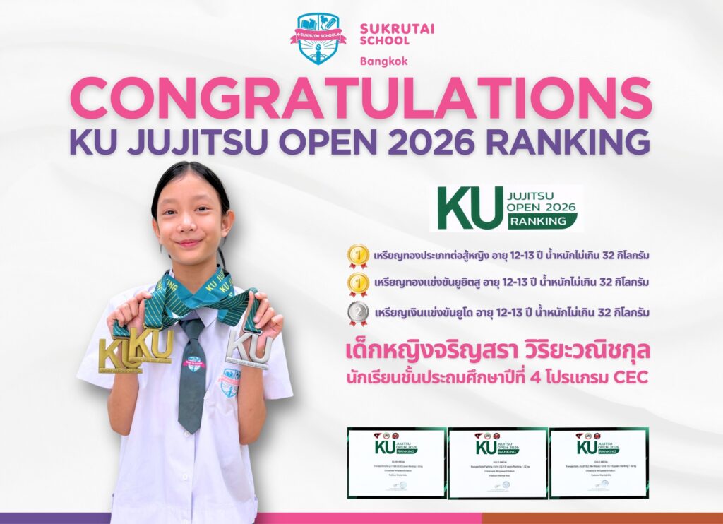 ขอแสดงความยินดีกับนักเรียนคนเก่ง โรงเรียนสุขฤทัย เด็กหญิงจริญสรา วิริยะวณิชกุล นักเรียนชั้นประถมศึกษาปีที่ 4 โปรแกรม CEC ในโอกาสที่ได้รับรางวัลเหรียญทองประเภทต่อสู้หญิงรางวัลเหรียญทองแข่งขันยูยิตสูรางวัลเหรียญเงินแข่งขันยูโด อายุ 12-13 ปี